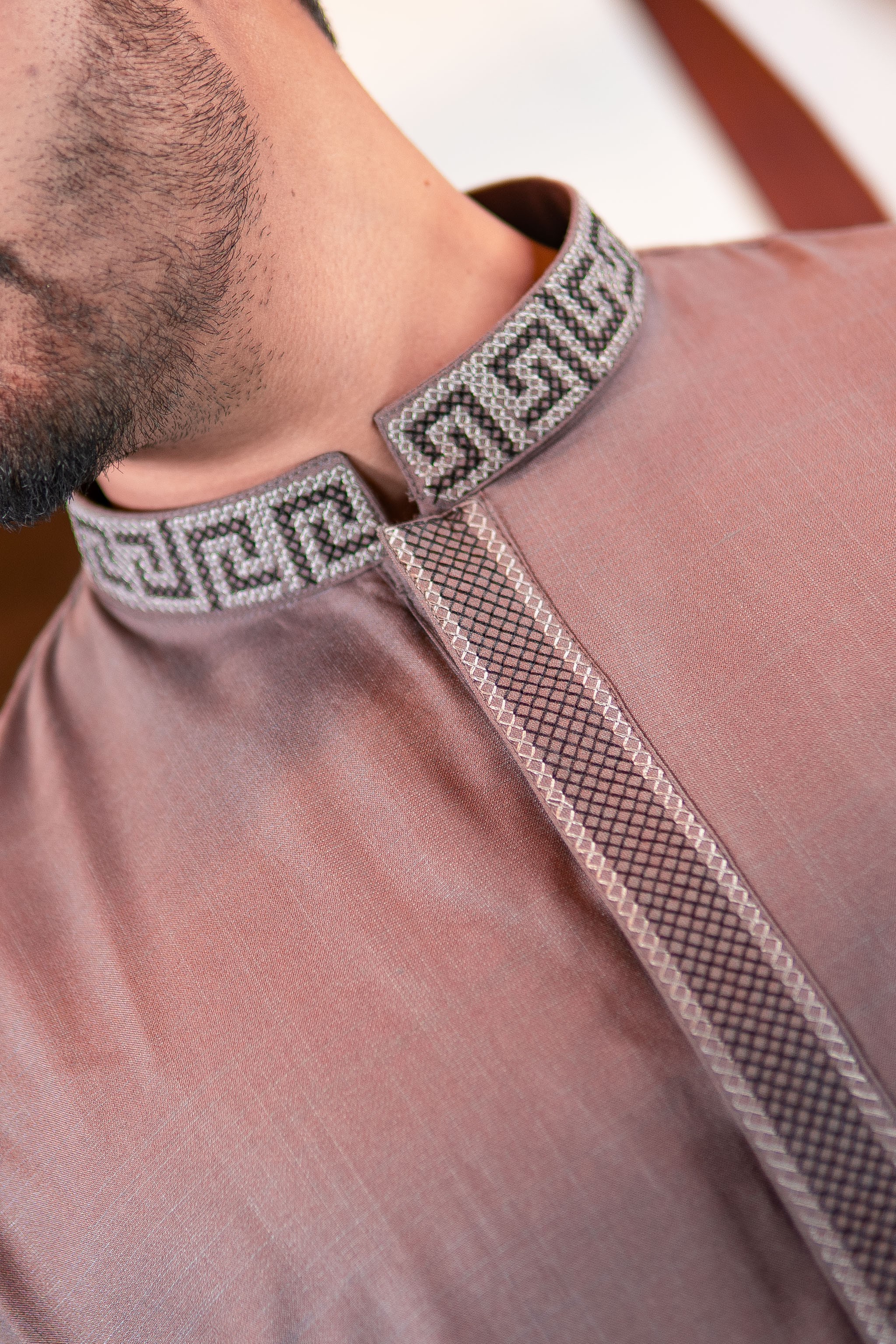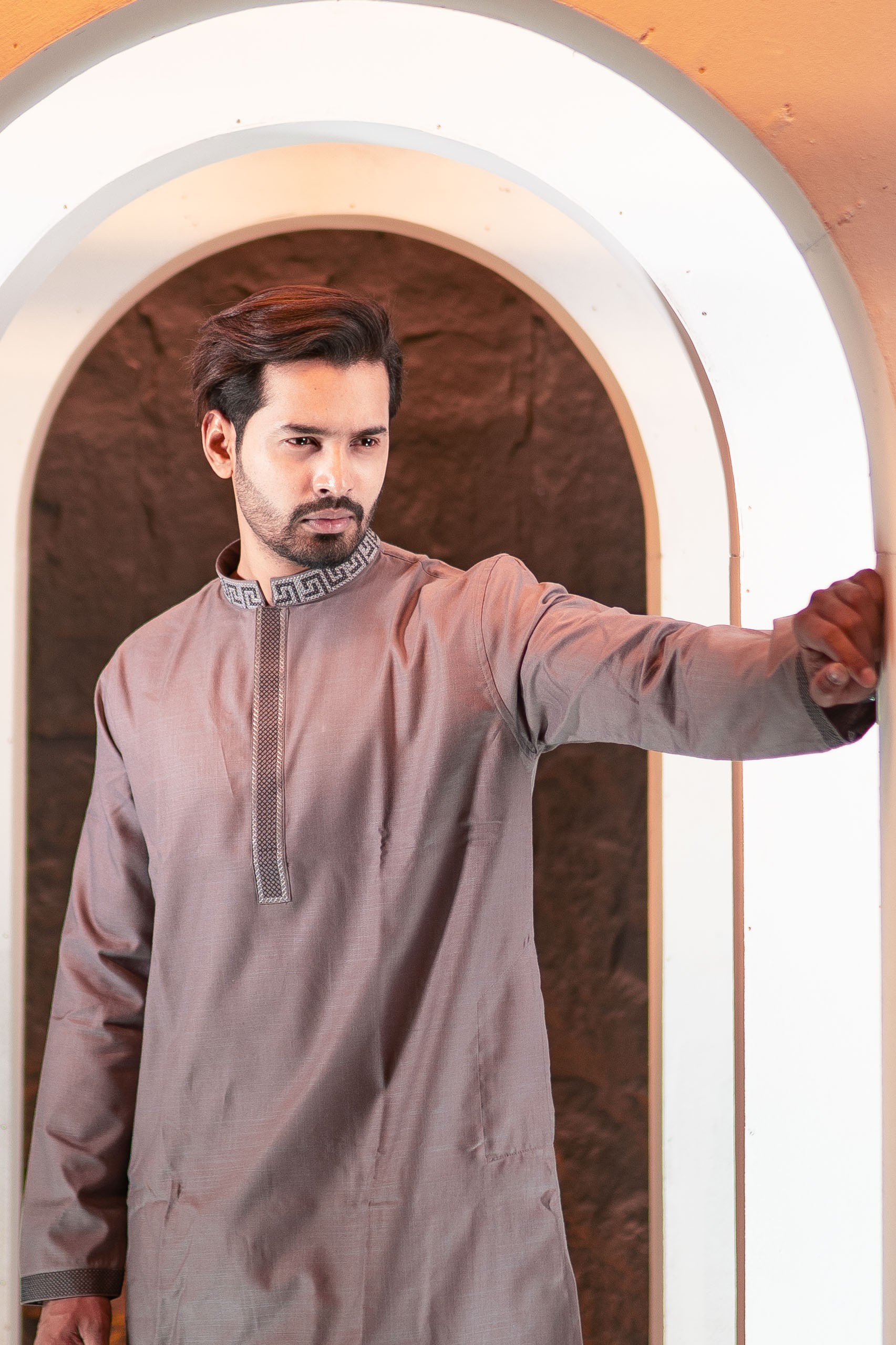 A sophisticated mocha brown Panjabi designed with a modern geometric embroidered collar. This piece combines tradition with contemporary elegance.