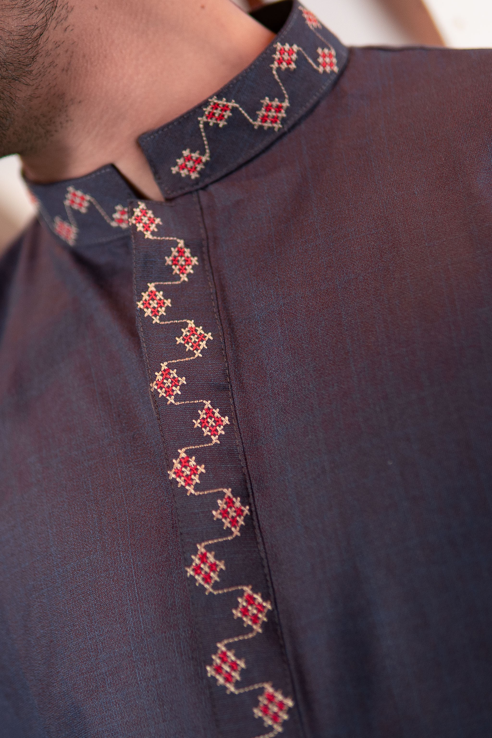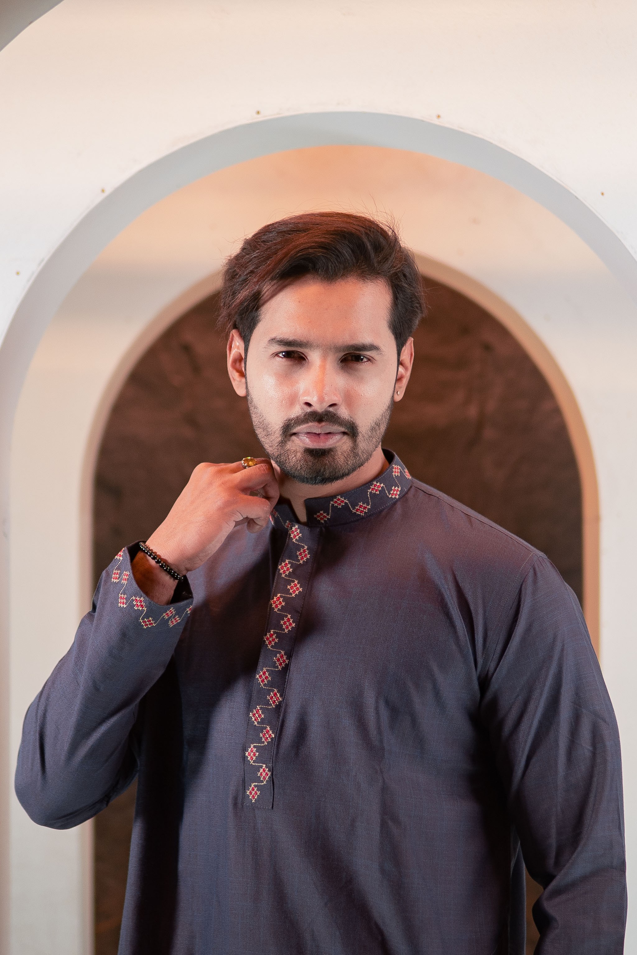 A sophisticated midnight grey Panjabi designed for a bold and confident look. The subtle embroidery along the collar and placket enhances its modern yet traditional appearance.