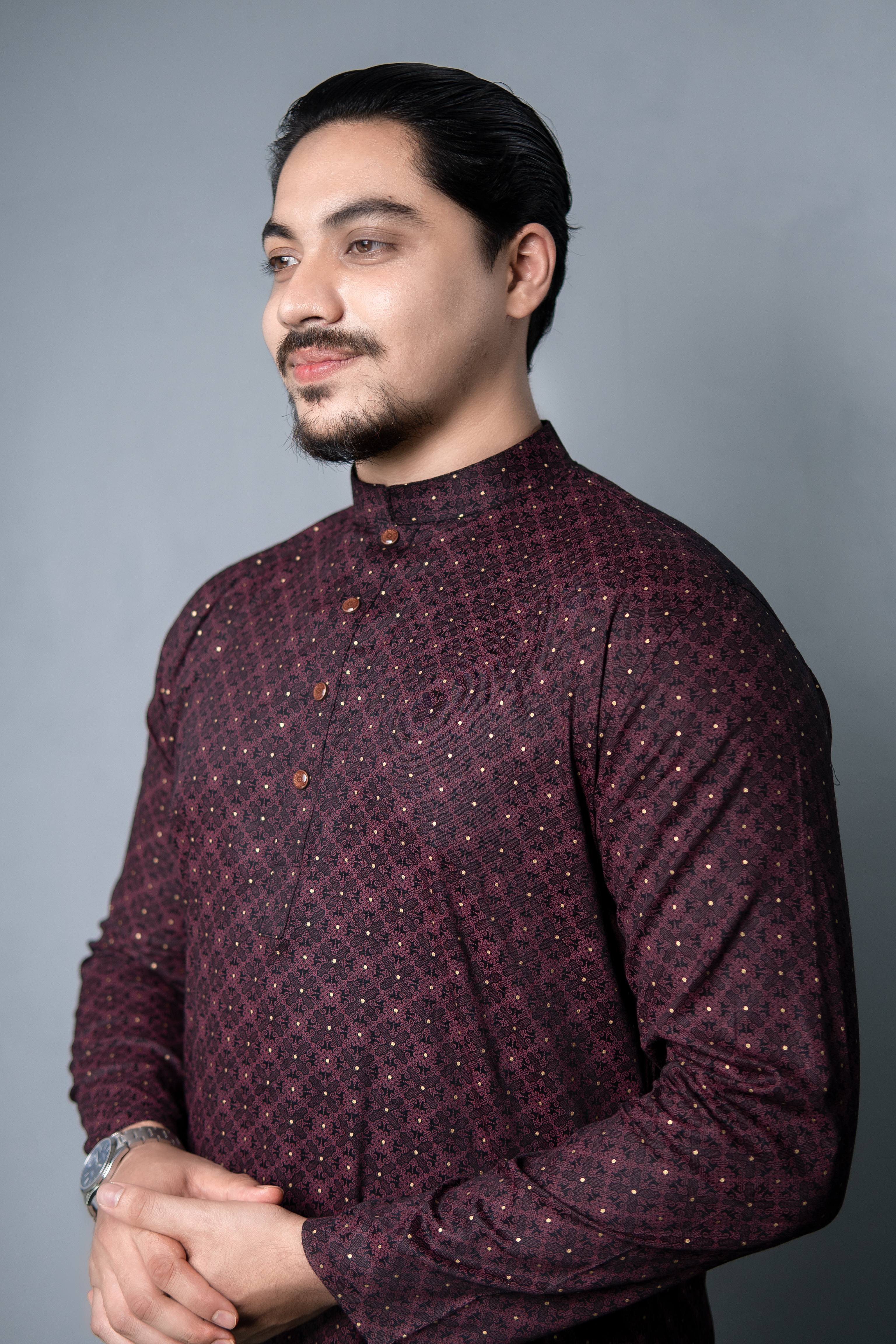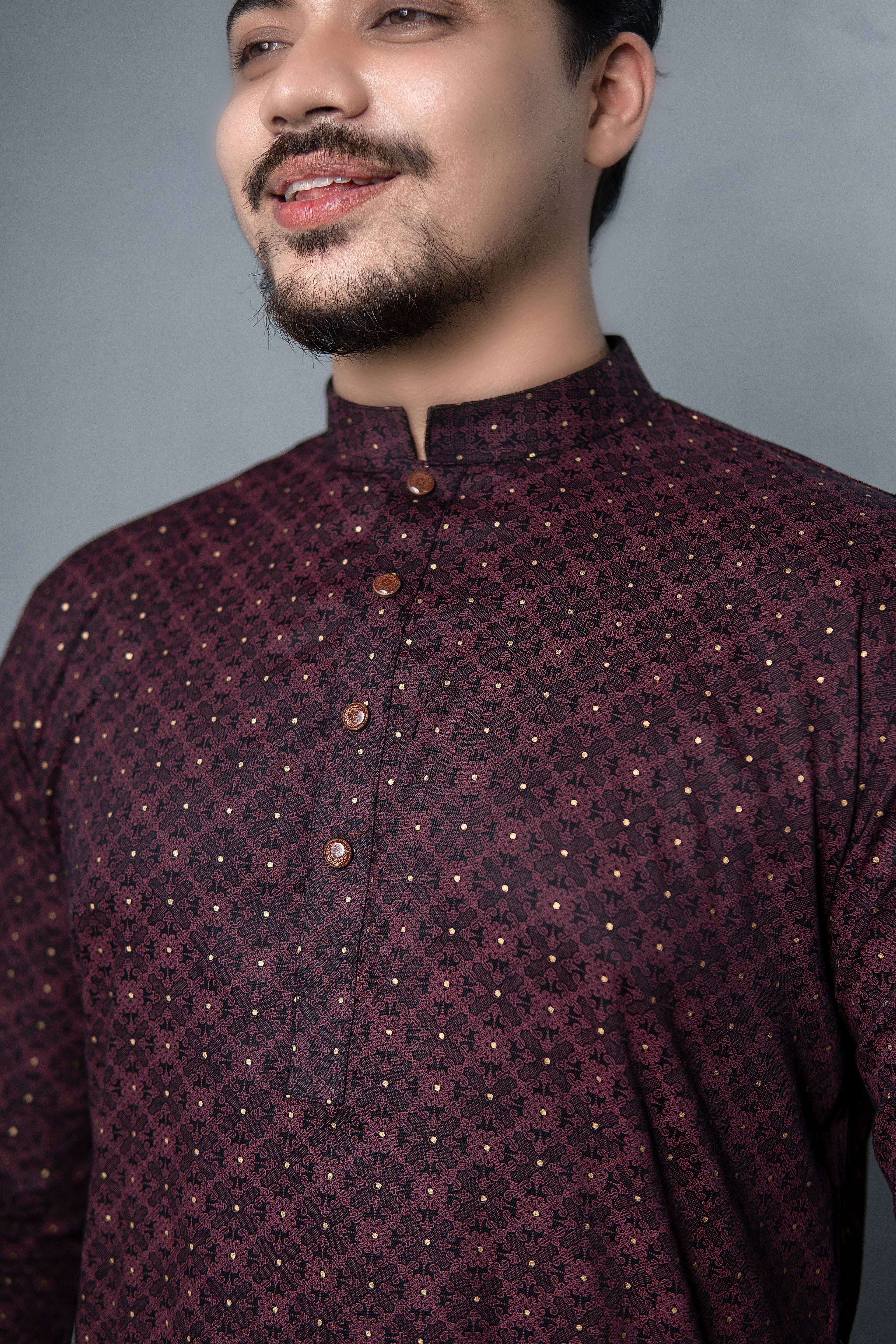 Regular Printed Panjabi Deep Burgundy - 006 - 1018