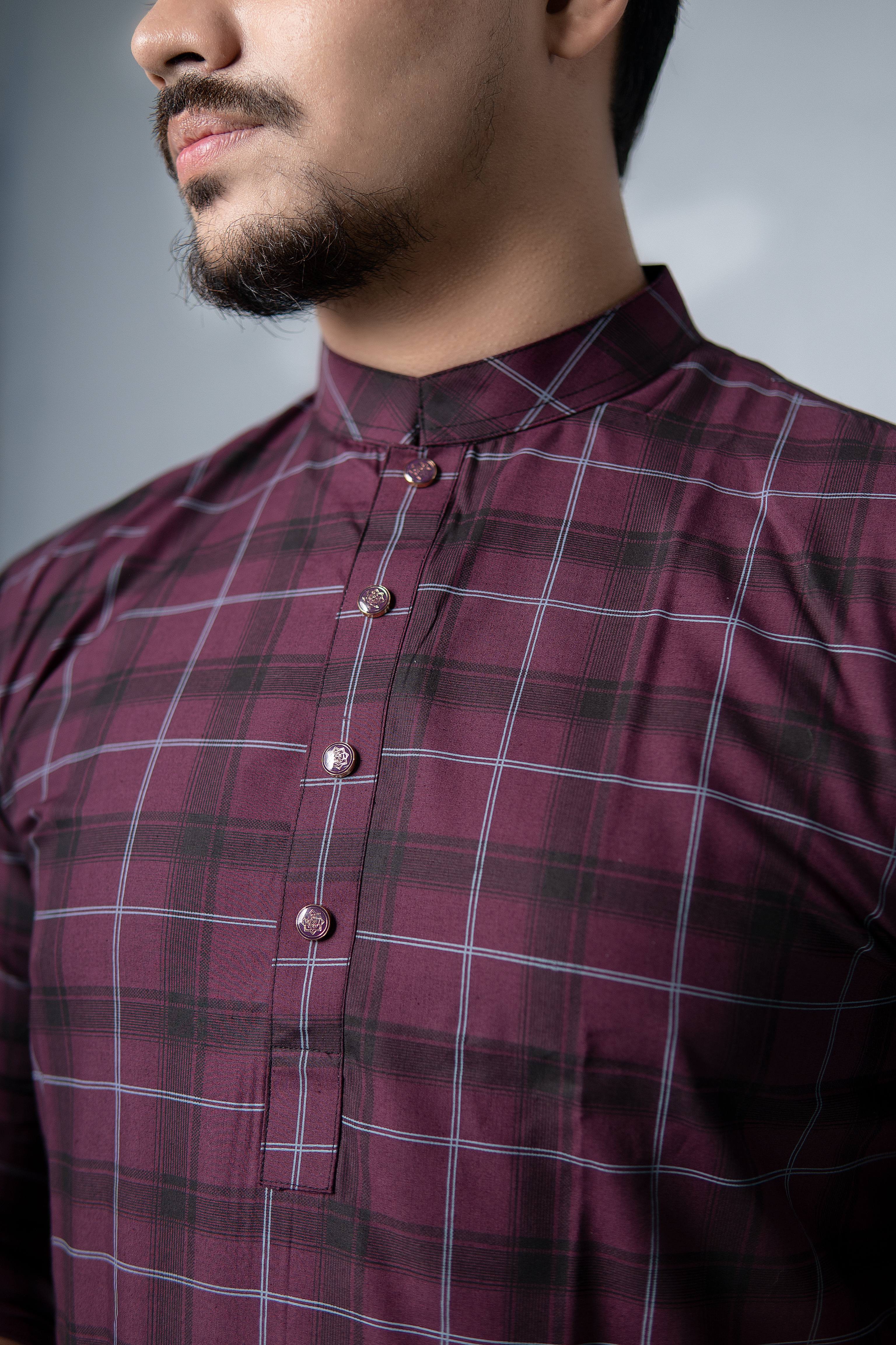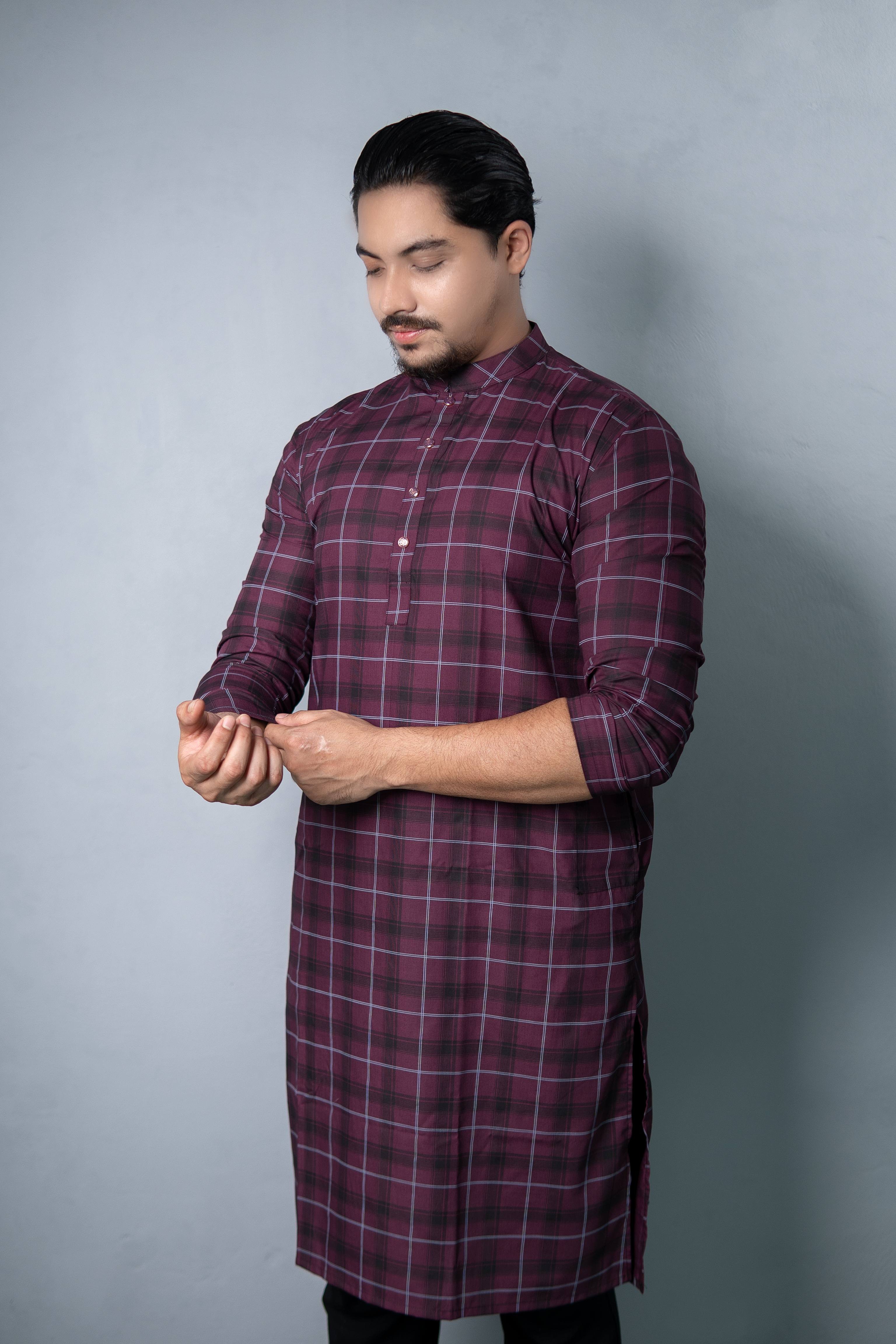 Regular Check Printed Cotton Panjabi – Purple with Burgundy & Black All-Over Print