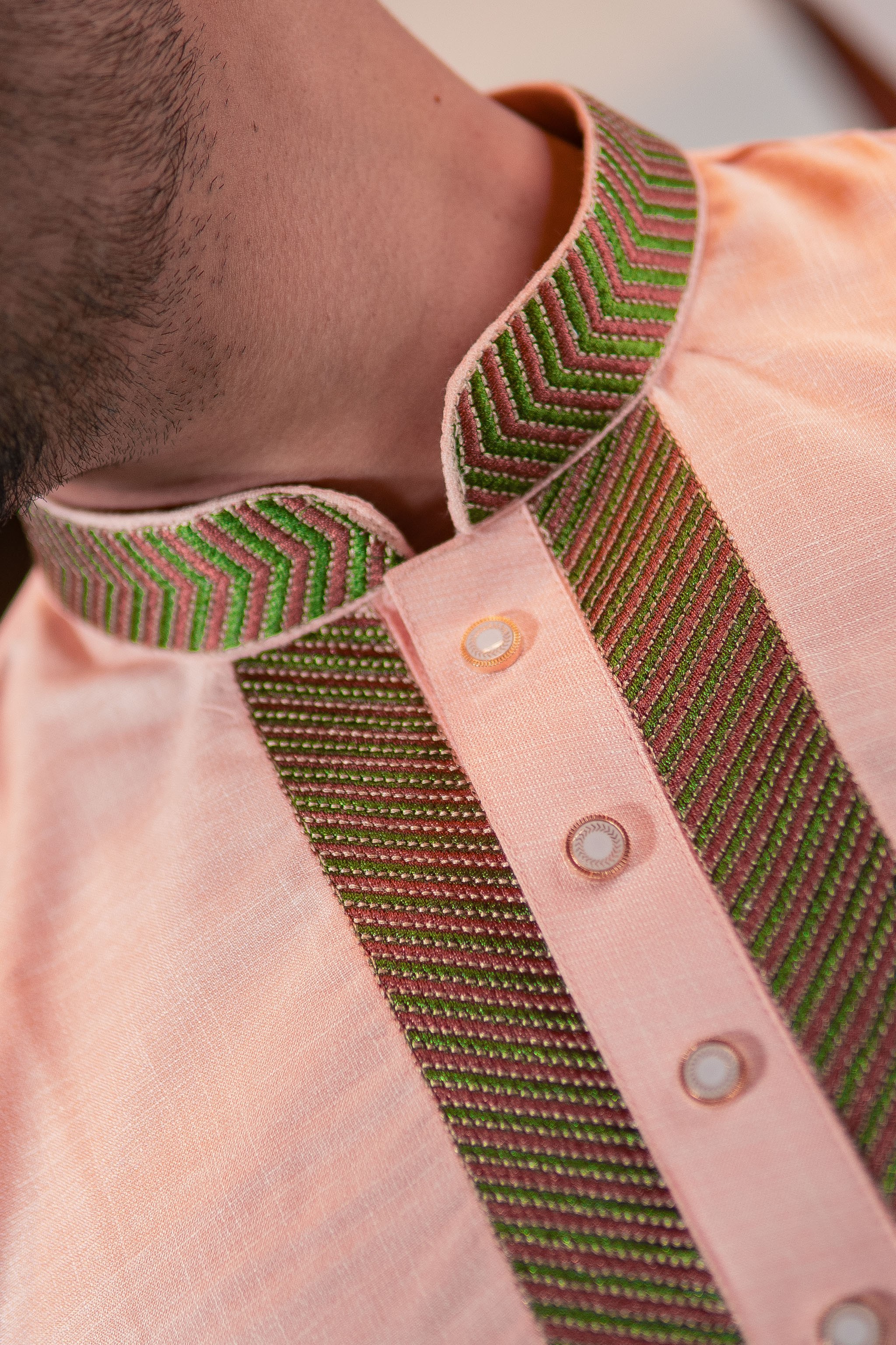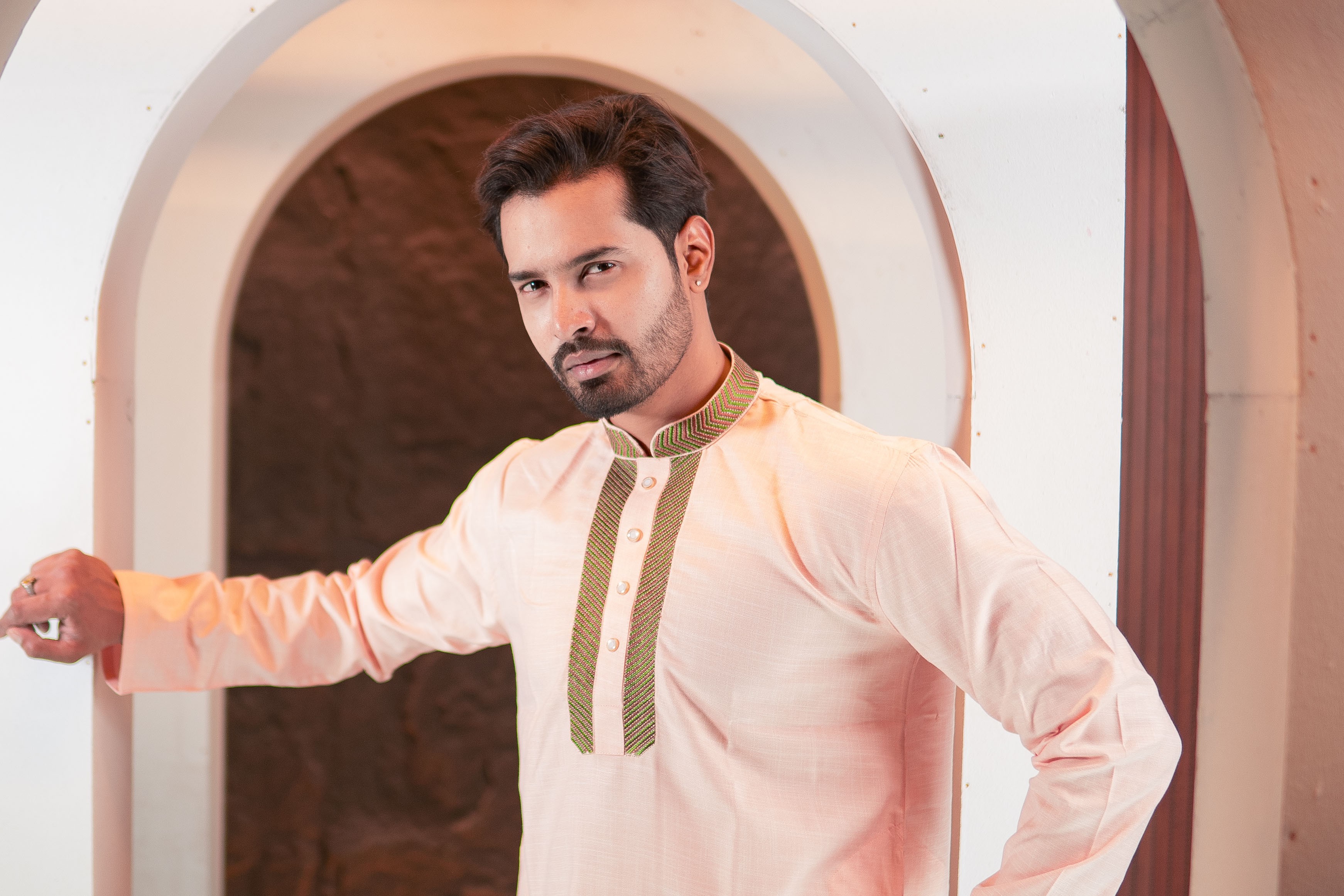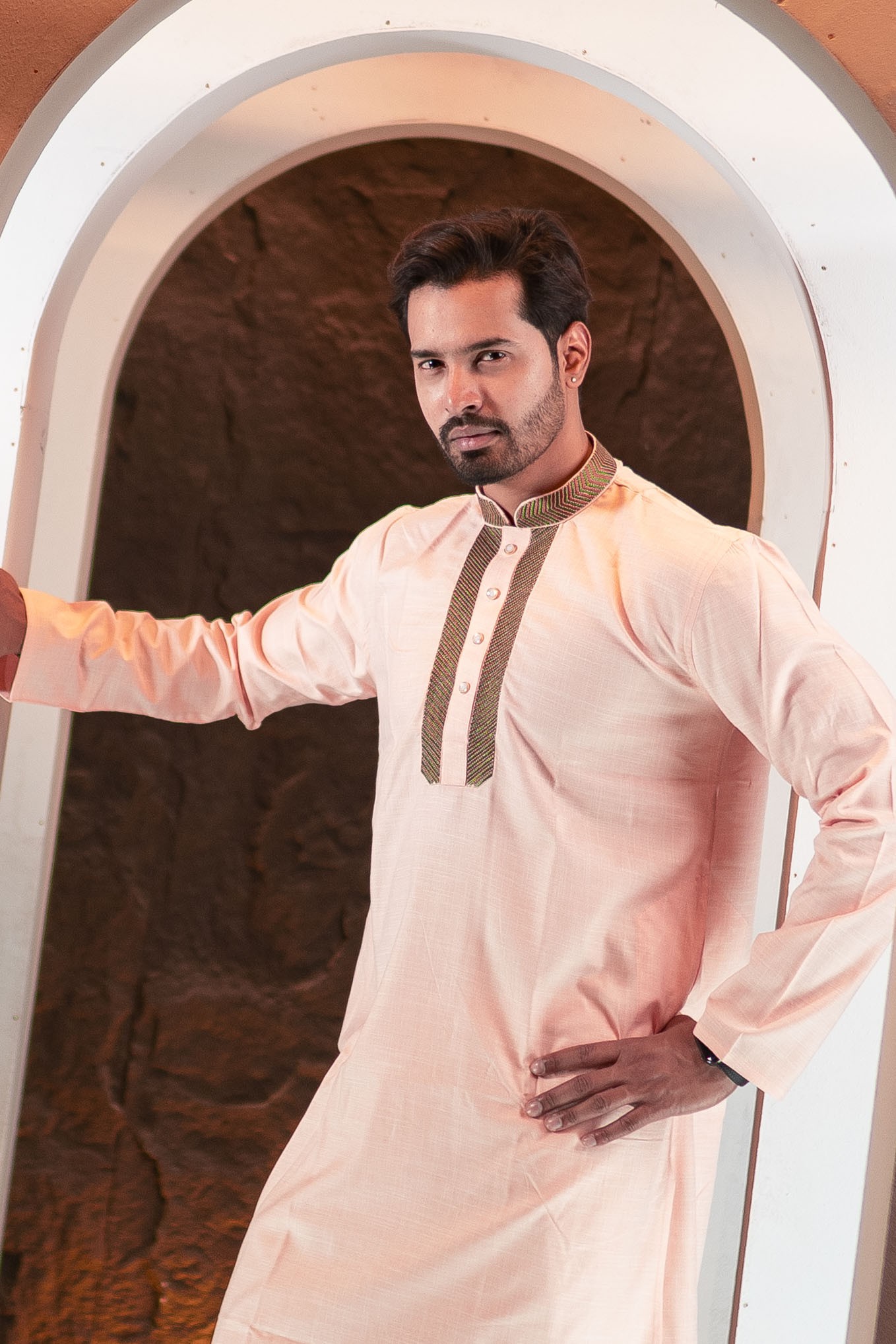 This soft peach Panjabi brings a fresh and elegant look with contrasting embroidered placket detailing. Designed to provide both comfort and sophistication for modern festive fashion.